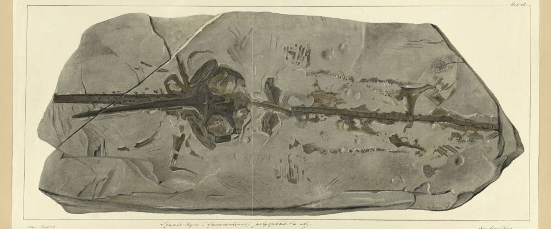 The Bristol Institution had been reluctant to lend the specimen to Agassiz in order to be copied by one of his artists, suggesting instead that he should use a drawing which had been prepared for Riley’s original 1833 paper. The watercolour attests to Agassiz getting his way in the end, but Riley complained that the thoracic and pelvic regions were damaged, presumably picked away by the penknife-wielding Agassiz.