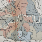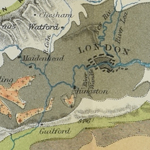 ‘Topographical [and Geological] Map of London and its Environs’ by Robert William Mylne, (1851). GSL Library collection. This is the first geological map of London. Its author, Robert William Mylne, FGS (1817-1890), had a successful consulting practice specialising in constructing water supply structures such as wells, reservoirs and drainage. It is likely much of the research derived from his work as a water engineer in the city.