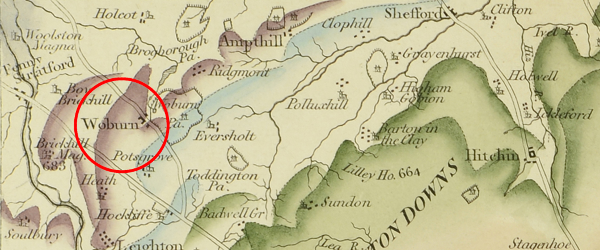 Worburn Park (circled), the seat of the Dukes of Bedford, as shown on William Smith's 1815 Map