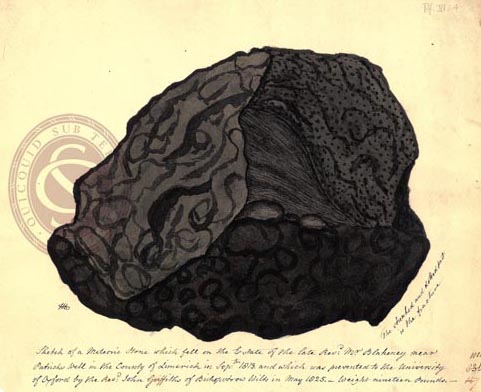 Benett’s caption reads: “Sketch of a Meteoric Stone which fell on the estate of the late Reverend Mr Blakeney near Patricks Well in the County of Limerick in September 1813, and which was presented to the University of Oxford by the Reverend John Griffiths of Bishopstrow, Wiltshire in May 1825 - weight 19 pounds. The streaked and dotted part is the fracture.”