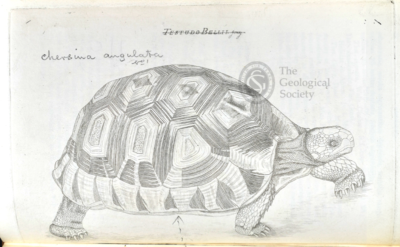 Left: Testudo Belli gray/Chersina angulata, etched by Emma Juliana Gray from a drawing by James Sowerby, 1828. From John Edward Gray, ‘Synopsis reptilium; or short descriptions of the species of reptiles’ (1831). GSL Library reference: Tract M9 f5.