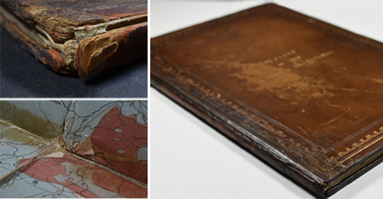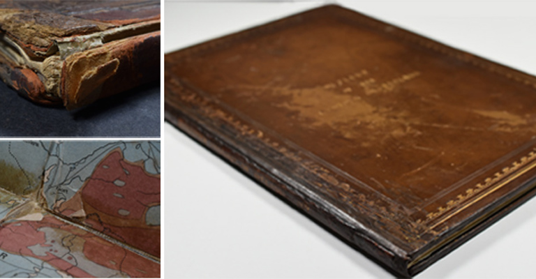 Condition of the first edition copy of Richard Griffith’s ‘Outline of the geology of Ireland’ (1838) before and after conservation. The volume, which was privately circulated by Griffith, contains a copy of the first published geological map of Ireland. Many thanks to the History of Geology Group which generously sponsored its conservation.