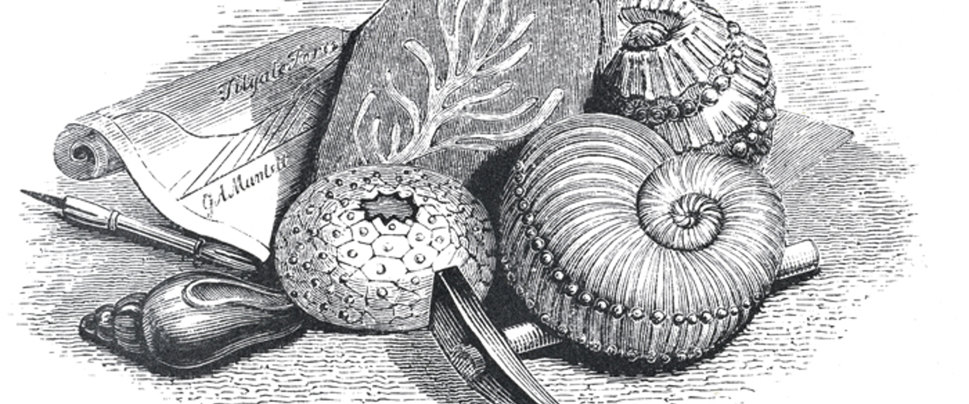 Left: Title page illustration from Gideon Mantell's 'A pictorial atlas of fossil remains…' (1850), sponsored in 2014